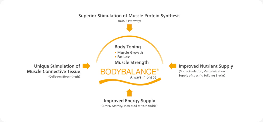 Recent investigations have shown that BODYBALANCE® significantly boosts the mTOR pathway, a crucial protein for metabolism. This pathway maintains the balance between protein synthesis and degradation, promoting lean tissue growth.